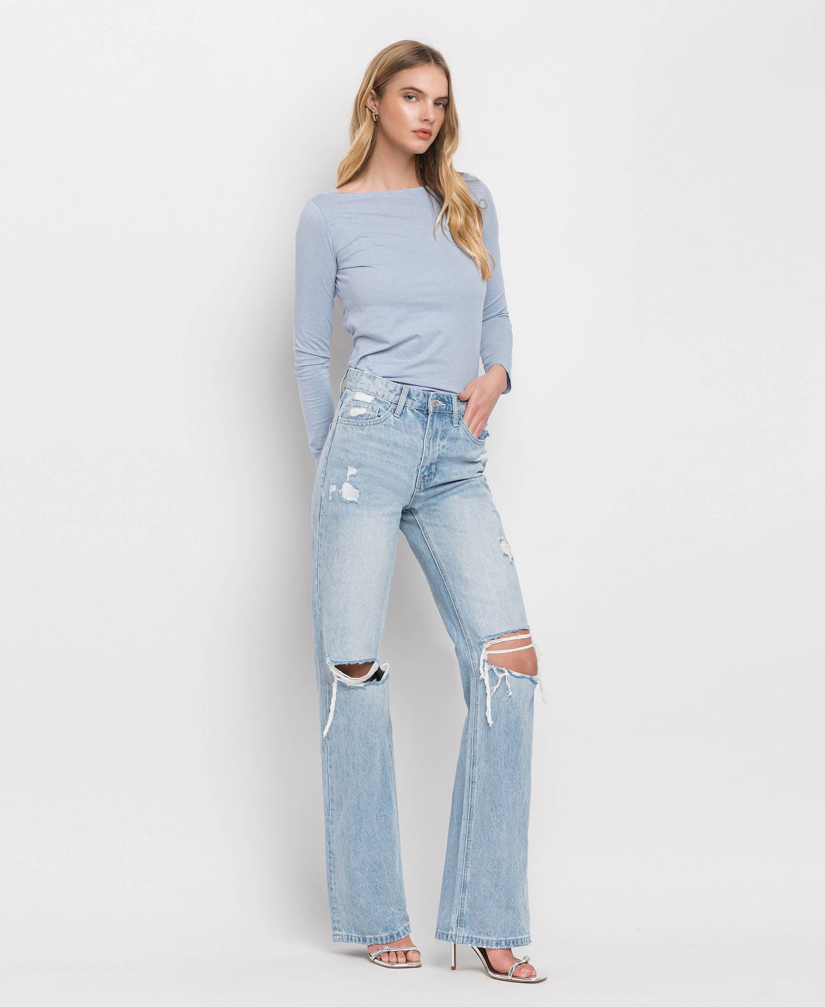 90'S VINTAGE SUPER HIGH RISE FLARE JEANS NON STRETCH DENIM, SUPER HIGH RISE WAIST, 90'S VINTAGE STYLE, 5 POCKETS, DISTRESSED DETAIL, FINISHED HEM, FULL LENGTH, LIGHT WASH, FLARE JEANS F. RISE: 11 1/4" / INSEAM: 34" / LEG OPENING: 20" MODEL IS 5'10" WEARING A SIZE 26