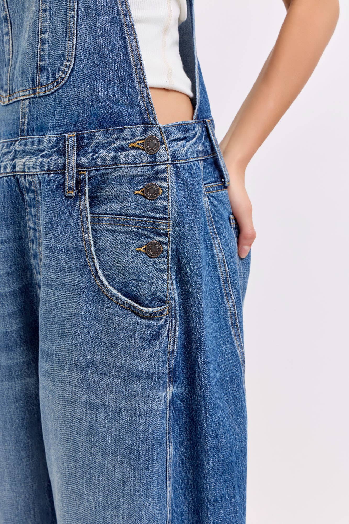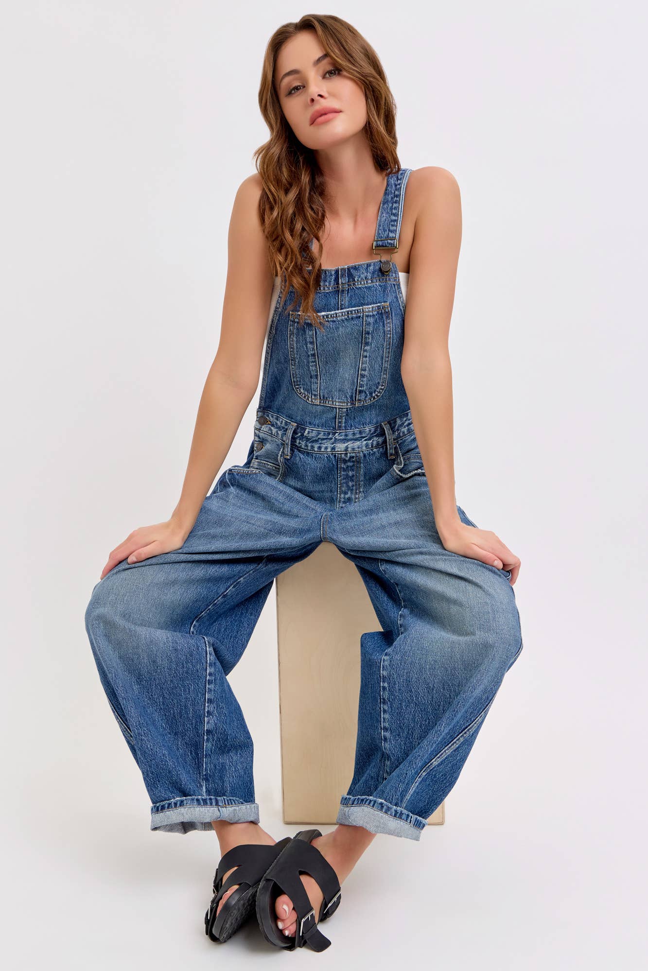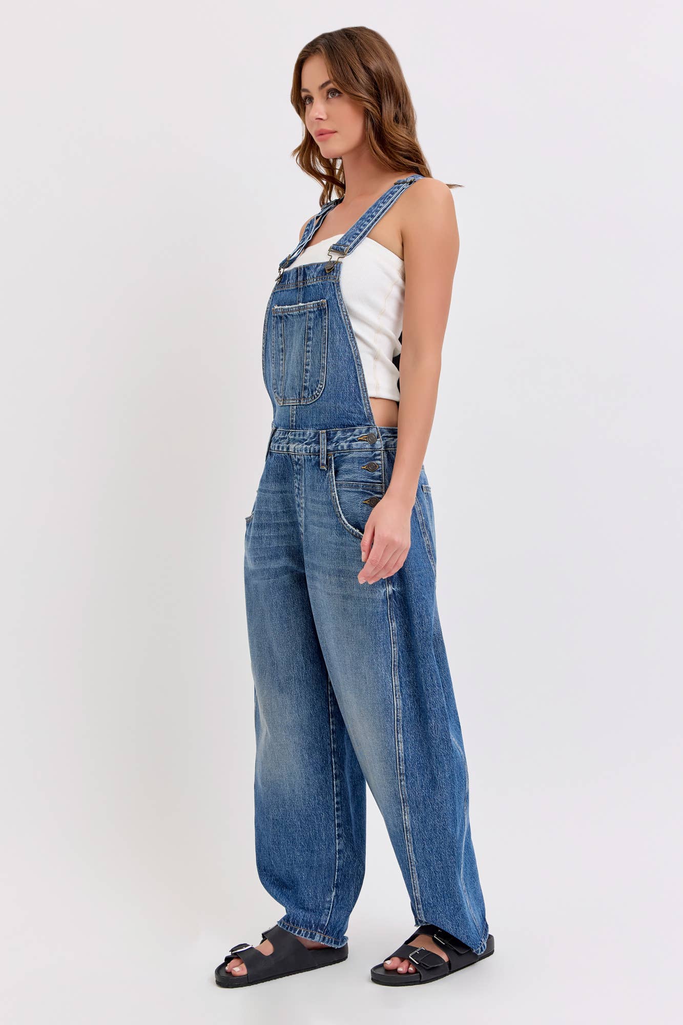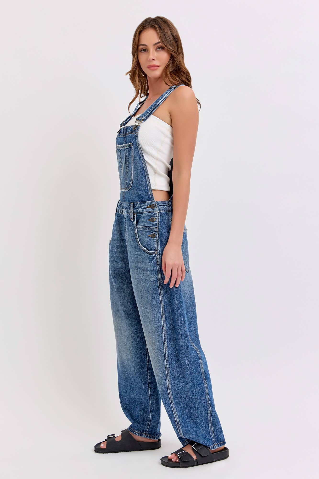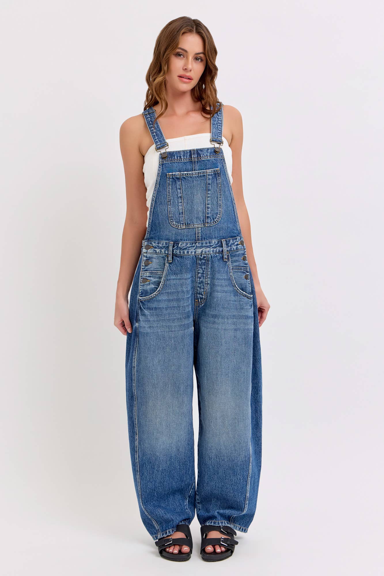 Mid-waisted Barrel Overall Belt loops + Adjustable straps Medium Denim Import Inseam 27" Rise 13” Fabric Content: 100% Cotton